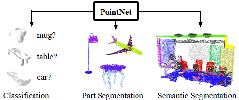 PointNet directly takes point clouds as input with three coordinates(x, y, z) and provides object classification, part segmentation, scene semantic parsing.